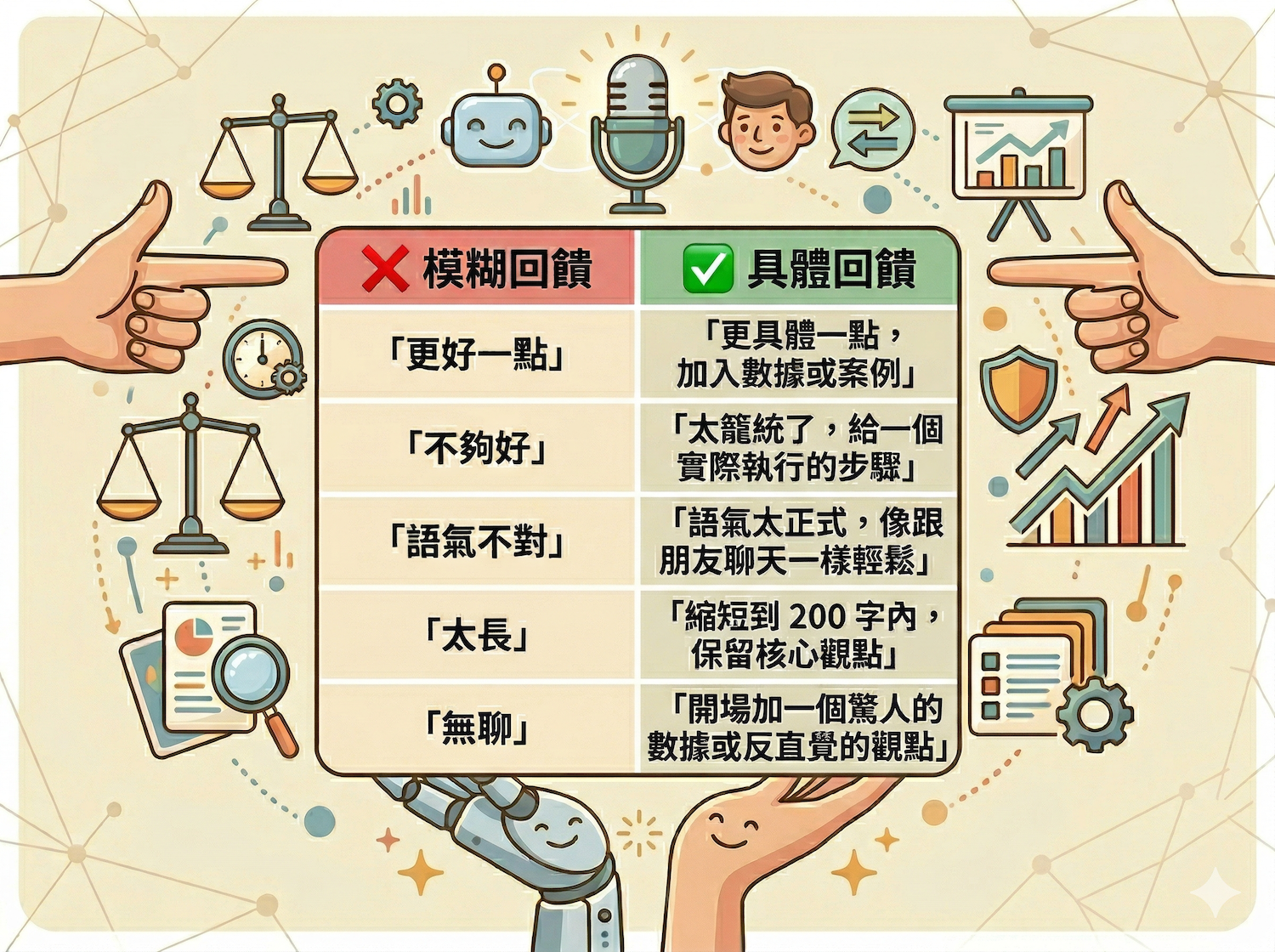 每一輪都給具體的修正指令,不要只說「更好一點」。