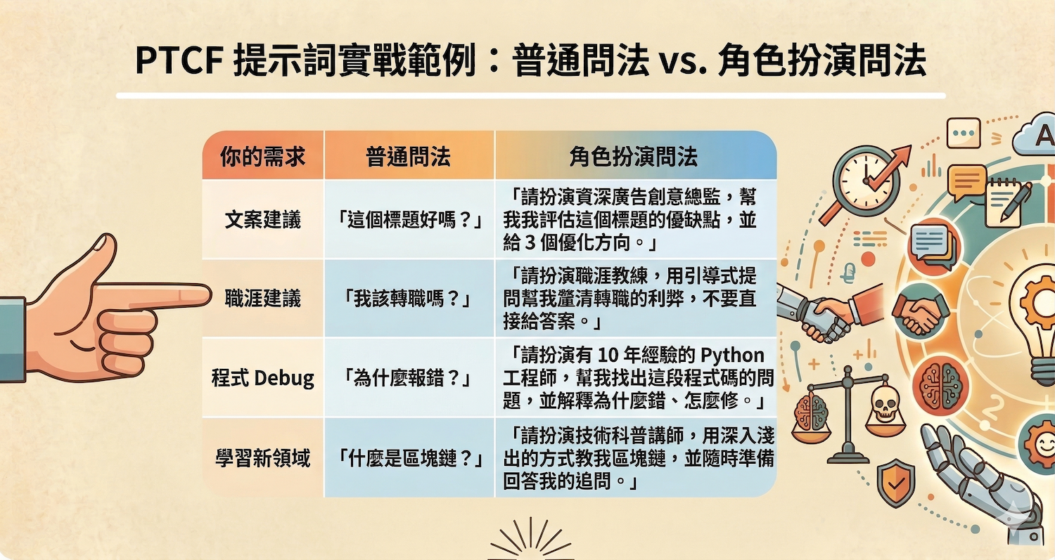 為什麼有效? 角色扮演給了 AI 一個「專業框架」,它會自動調用相關領域的知識、語氣、思考模式,產出更符合你的期待。