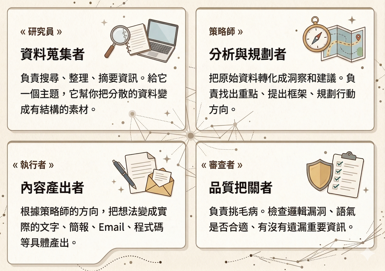 一個典型的 AI 虛擬團隊,通常包含以下幾種角色。你不一定每個都需要,但認識它們,你才能根據自己的工作性質來配置。